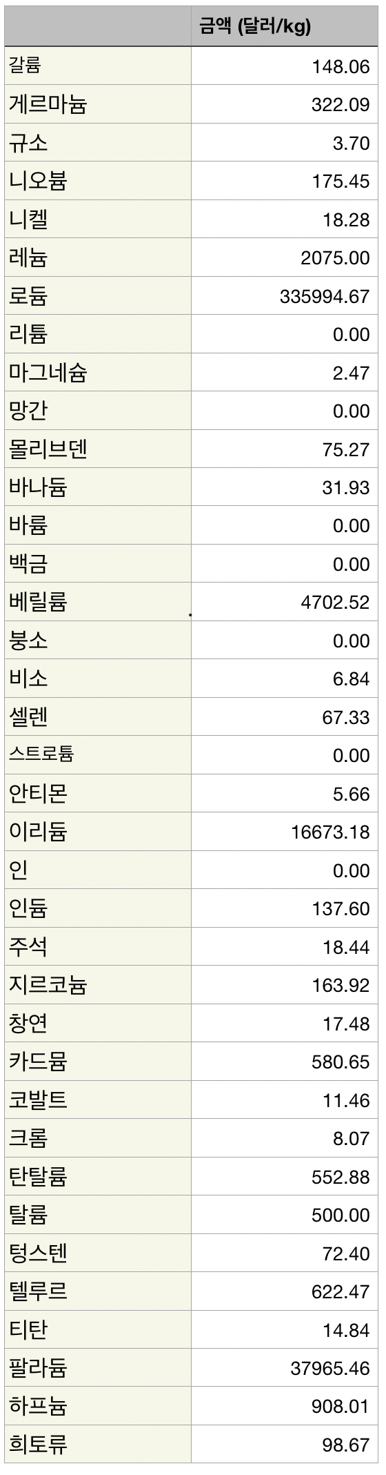 - 1kg 당 약 4억 정도, 금(약 8천만원) 보다 비쌈