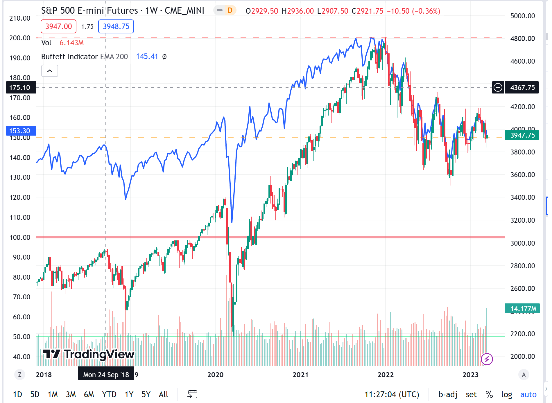 미국의 버핏 지수는 코로나 이후 부양 정책으로 2021년 11월 최고 약 200% 찍고 현재 153%입니다.
