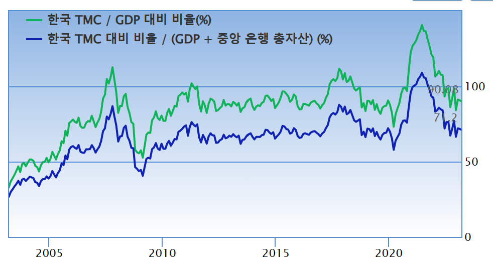 현재 한국 버핏 지수는 약 90%입니다. 미국은 여전히 153%인데.. 역시 미장은 강하네요.