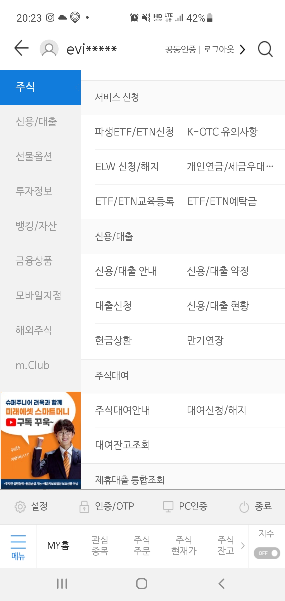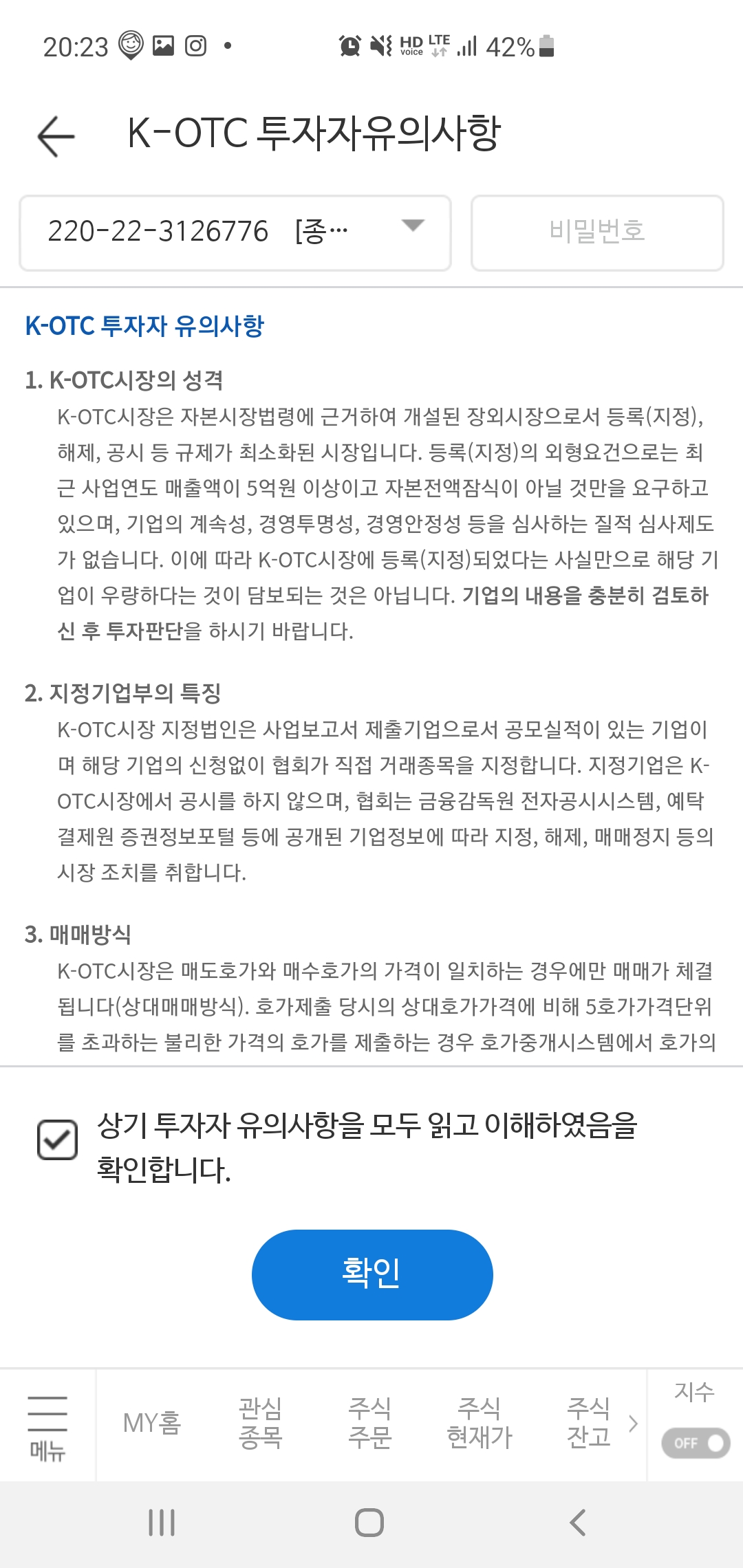 메뉴 -> 주식 -> K-OTC 유의사항 ->확인
