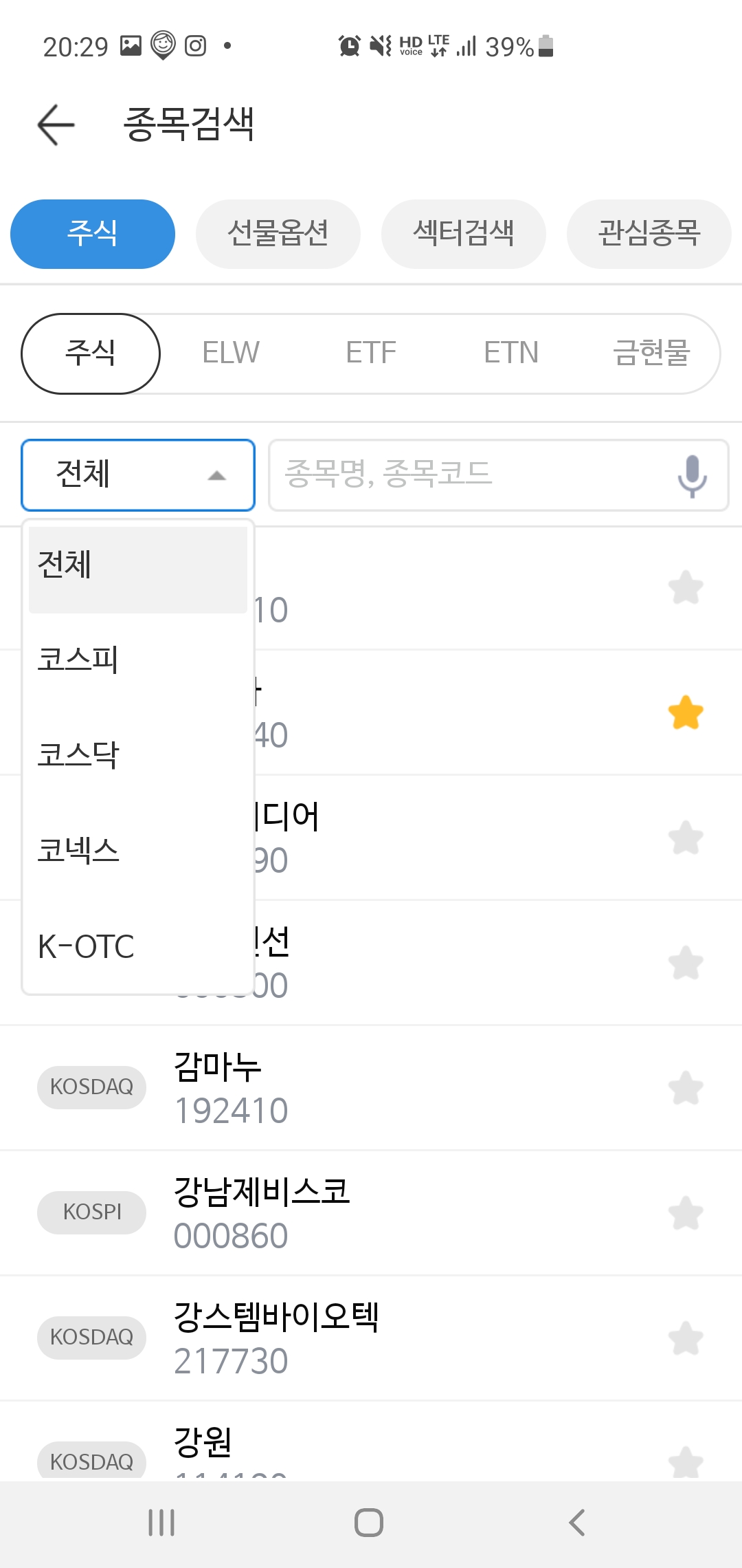 종목검색 -> 주식 -> 전체 클릭 ->K OTC 선택