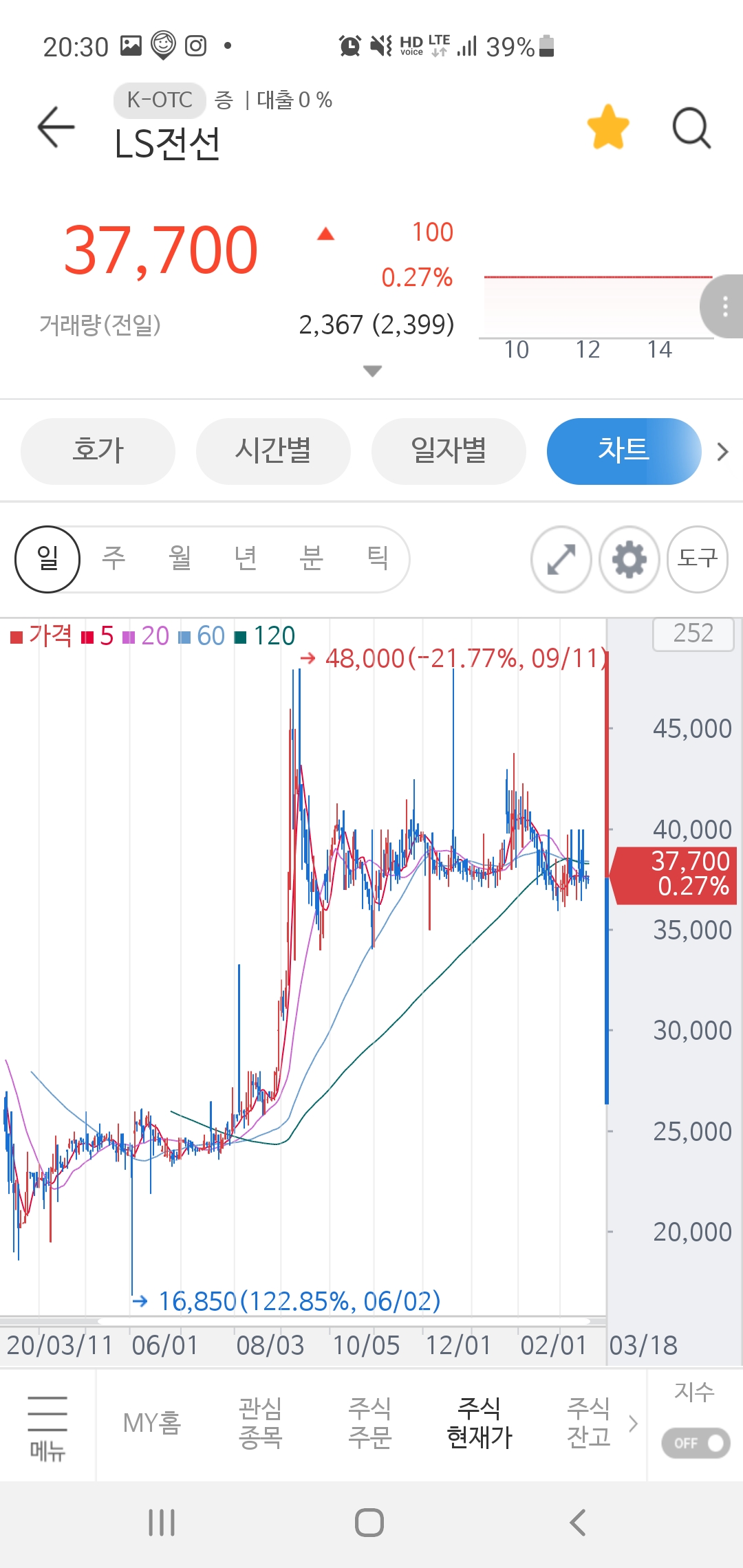 그중에 LS전선(이전에 보유 종목 ^^;)을 보면 거래량이 얼마 안 되는 것으로 볼 수 있습니다.