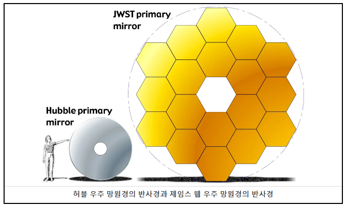 - 광학 망원경 요소 : 육각형 조각 18개의 6.5m 거울로 적외선 빛을 받는 주경과 재 반사하는 74cm 부경으로 구성