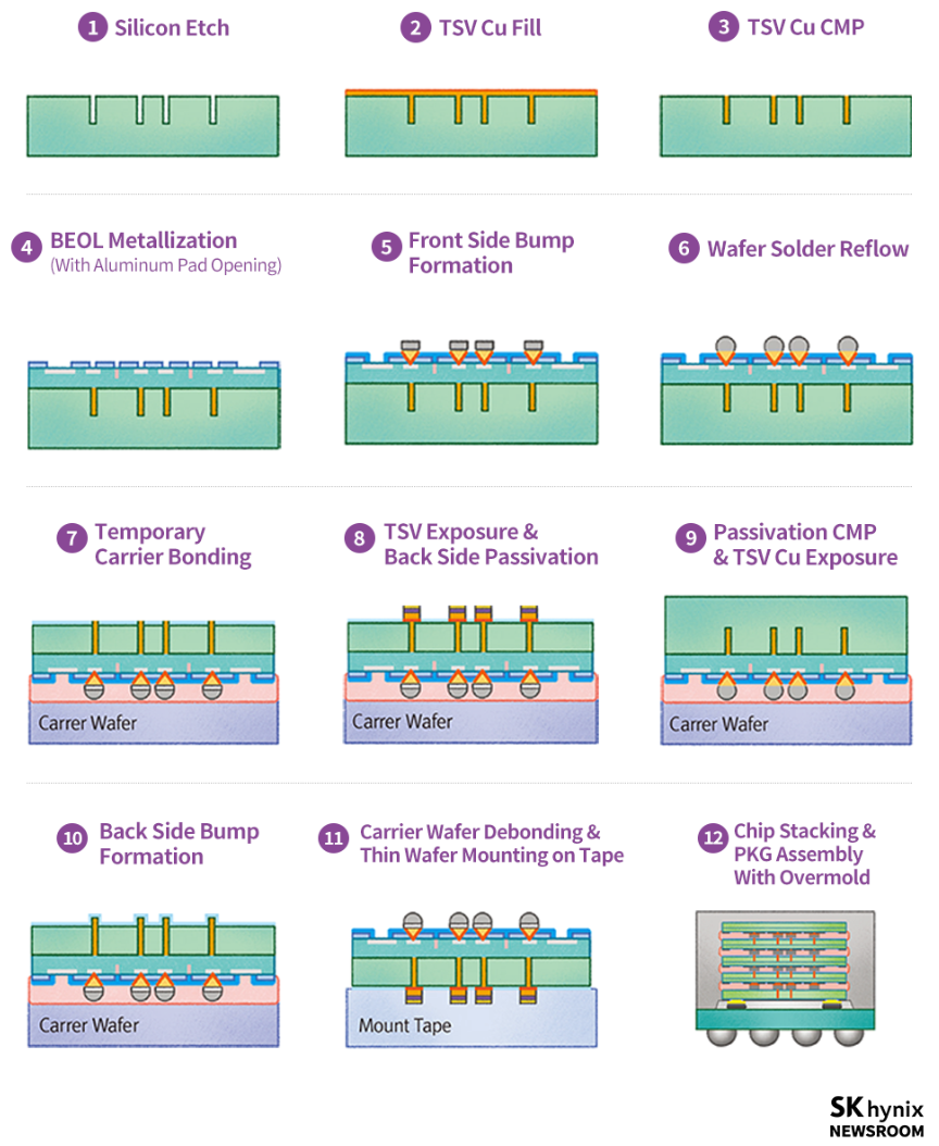 HBM 반도체는 기존의 와이어를 이용해 칩을 연결하는 대신 미세한 구멍을 통해 칩의 상단과 하단을 연결하는 TSV(Through Silicon Via) 공정으로 반도체를 생산합니다.