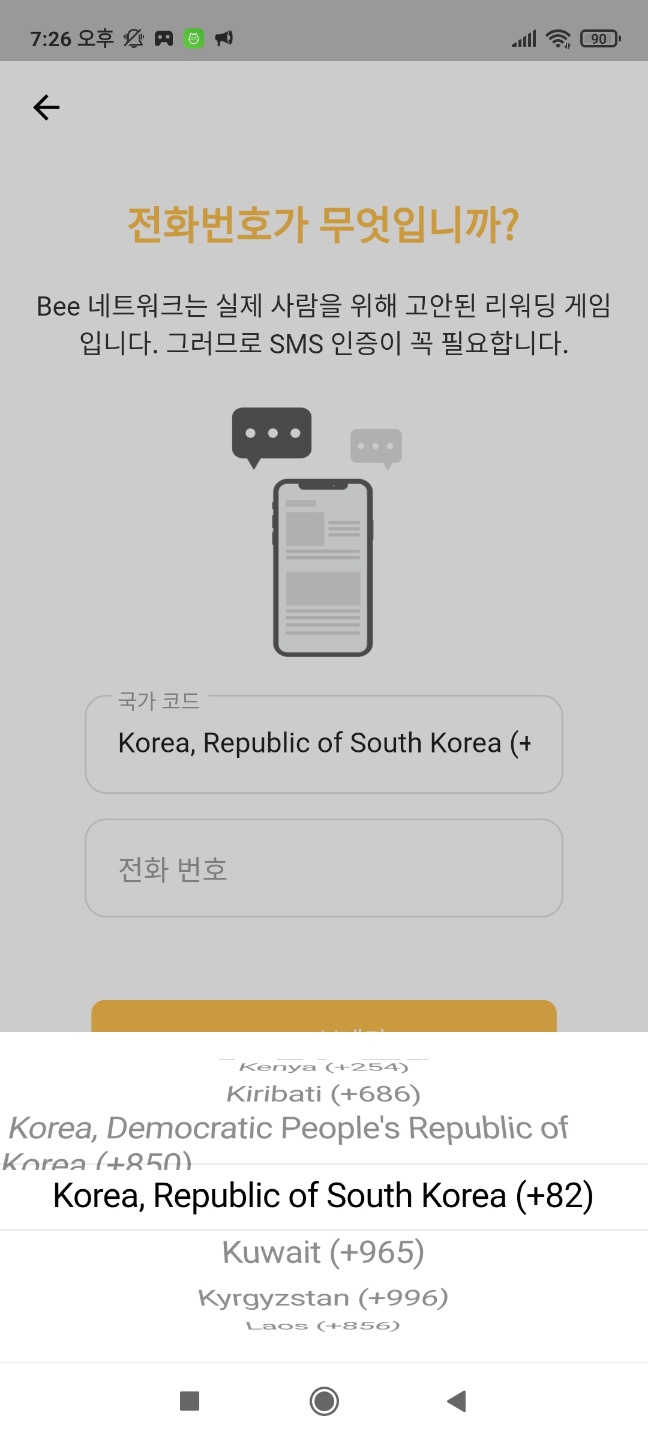 - 국가번호(Korea) 선택 ▶ 핸드폰 번호 입력