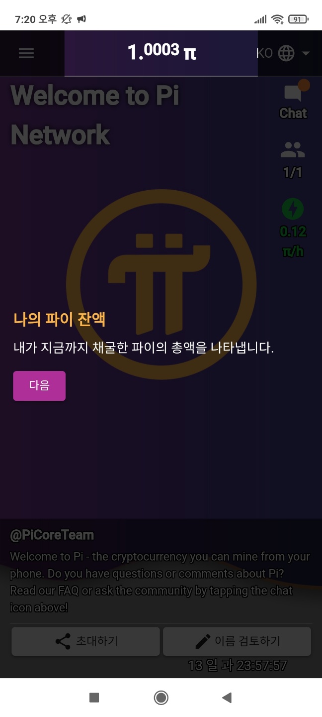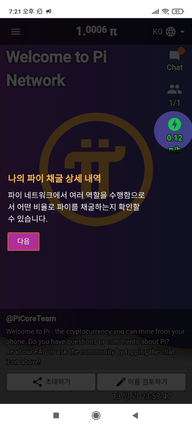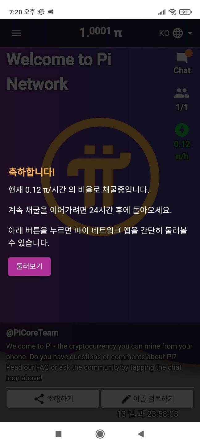 - 가입 끝 ▶ 파이코인과 같이 매일 24시 후 벌 모양 클릭