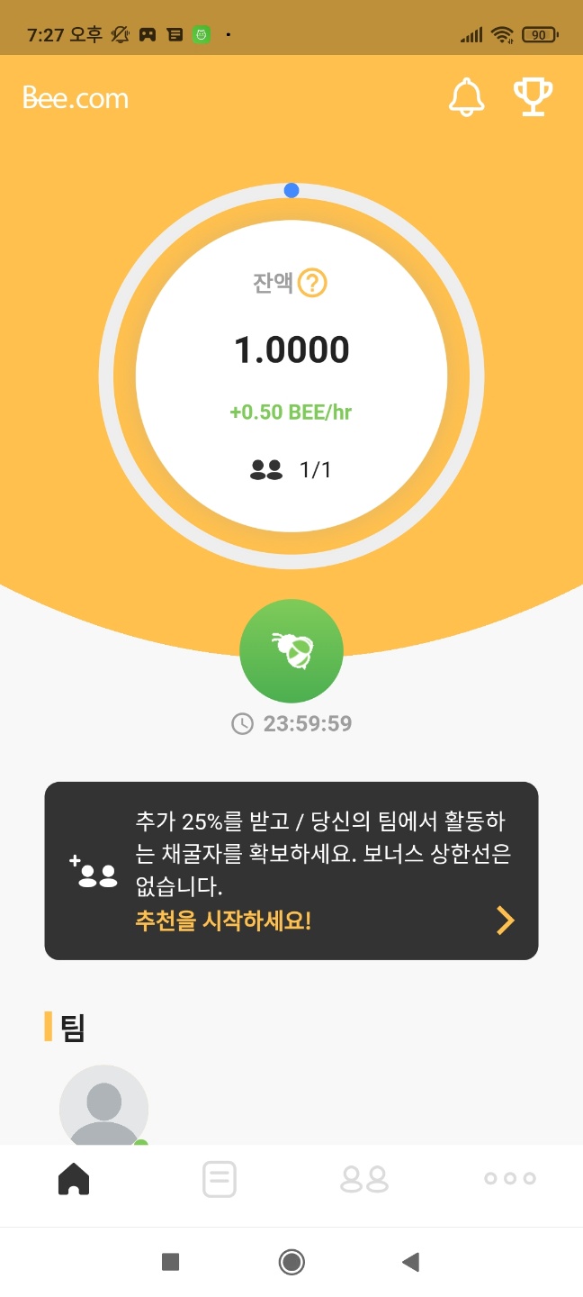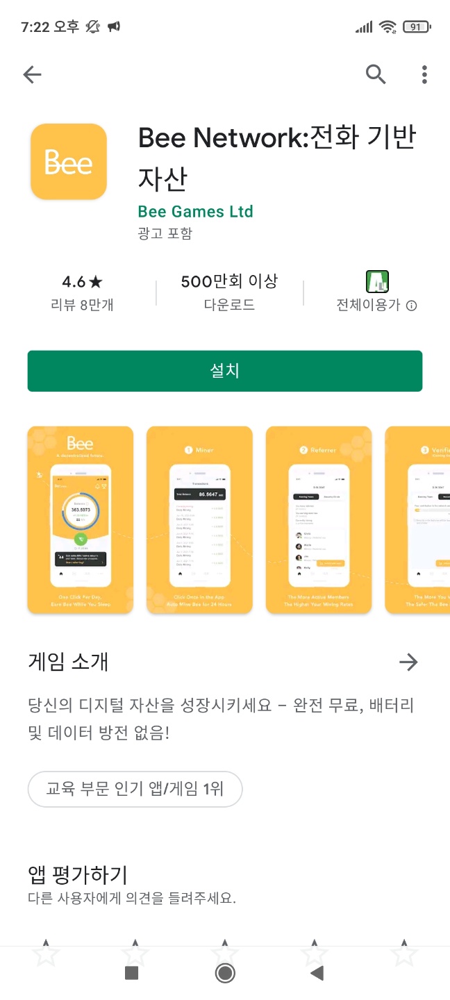 - 구글플레이에서 비(Bee) 코인 검색 설치(이미 500만 이상 사용)