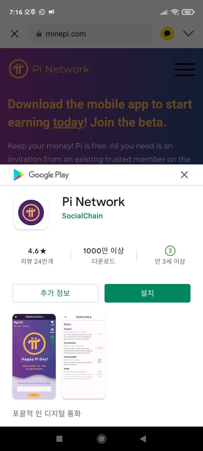 - 구글플레이에서 파이(Pi) 코인 검색 설치(이미 1000만 이상 사용)