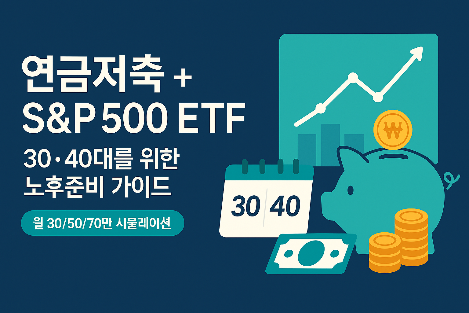 30·40대를 위한 노후 준비 전략. 연금저축(세액공제/납입·인출 규칙)과 S&P 500 ETF의 장점, 〈월 30/50/70만 × 30·40년·연 5~7%〉 시뮬레이션, 세금·물가 반영, 리스크 관리와 체크리스트까지.