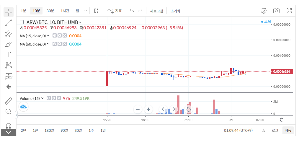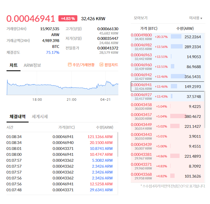 그 중서 4월 20일 어제 새로 상장한 아로와나(ARW) 토큰이 거래를 시작하고 30분 만에 50원에서 53,800원까지 폭등하였습니다.