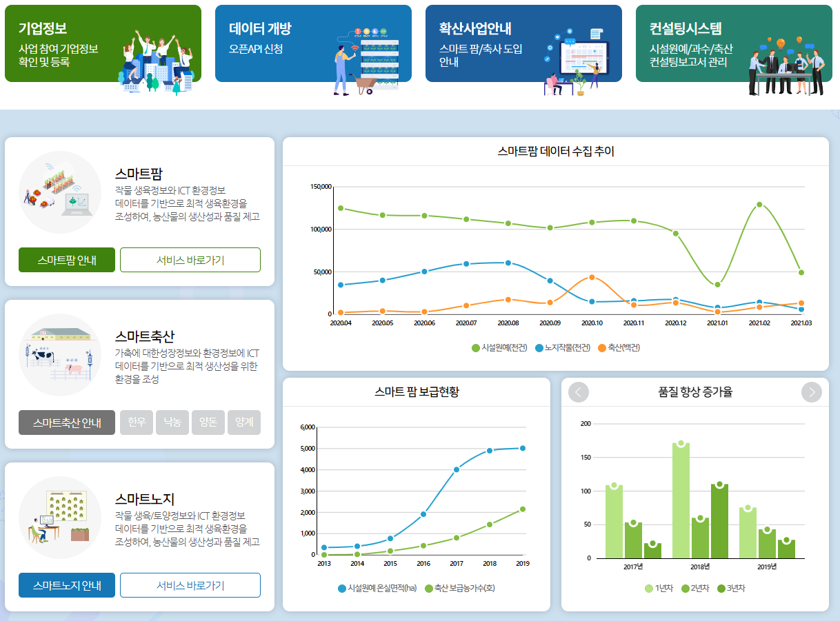 국책사업과 많이 연관되어 교육은 물론이고, 스마트팜 사업 지원, 자료 공유, 대출 등 많은 유용한 정보가 있습니다.