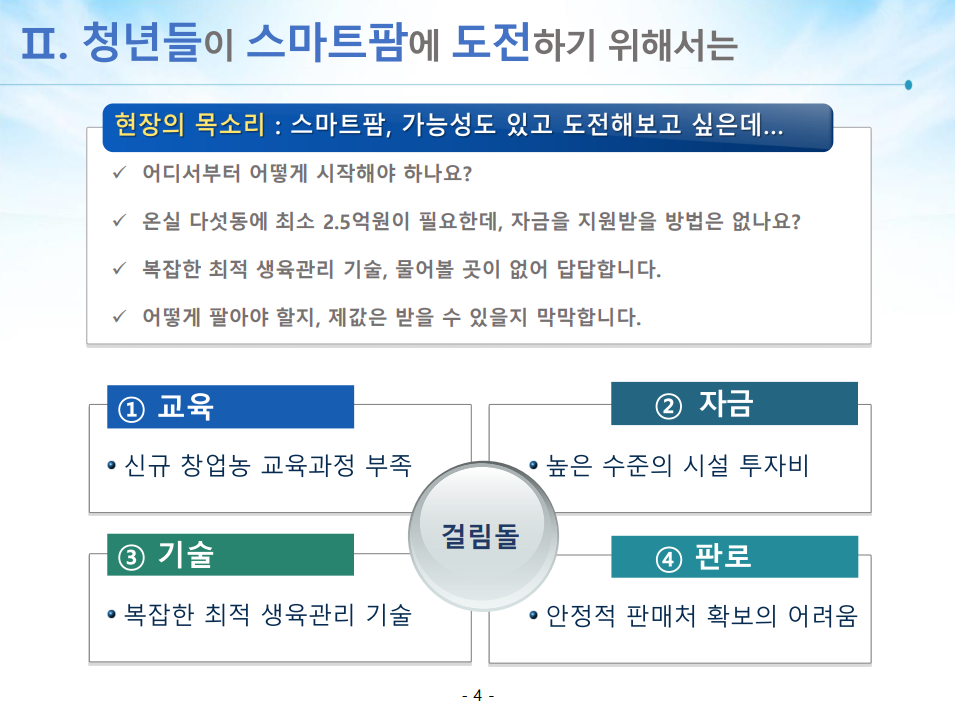 - 기존 농가들의 접근하기에 높은 장벽 : 영세농가, 고령화로 최신 기술 학습 어려움