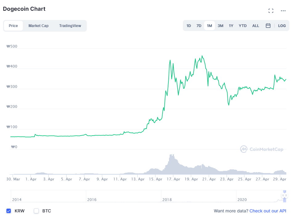 지금 현재 350원(김프제외) 정도로 거래되고 있으며, 다음주에 앨런 머스크가 도지코인에 또 뭐라고 언급할지 ㅠㅠ