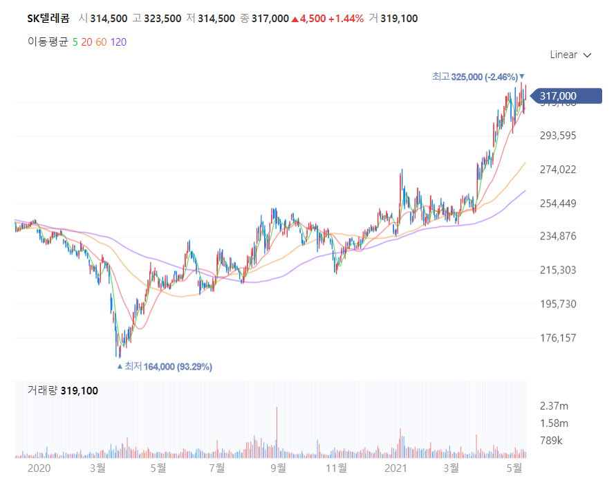 SK텔레콤은 아래 차트와 같이 52주 신고가 325,000월을 찍고 종가 317,000원 장이 끝났습니다.