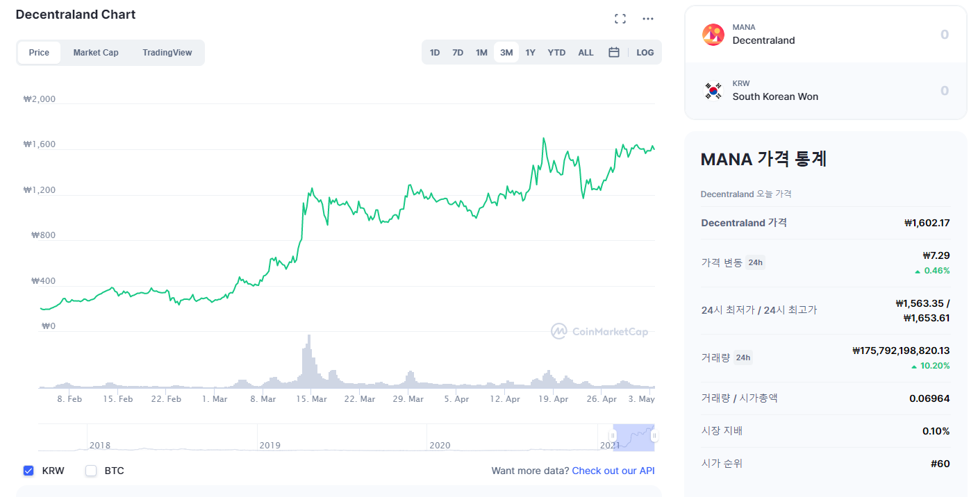 지난번 포스팅때 약 1100원이었고, 최근 코인 조정기간에 특별한 조정 없이 전고점을 뚫고 1600원(김프 제외) 정도로 거래되고 있습니다. 메타버스 세상과 잘 결합되어 있는 플랫폼으로 앞으로 성장세가 가장 기대되는 코인입니다.(개인적인 의견)